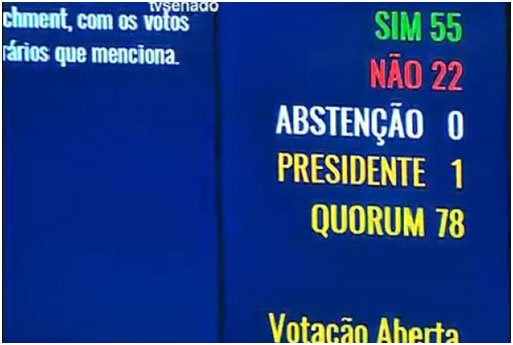 O Senado aprovou, por 55 votos a favor e 22 contra, a admissibilidade do processo de impeachment da presidenta Dilma Rousseff. Com isso, o processo será aberto no Senado e Dilma será afastada do cargo por até 180 dias, a partir da notificação. Os senadores votaram no painel eletrônico. Não houve abstenções. Estavam presentes 78 senadores.