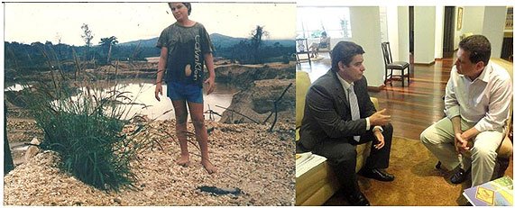Contra-ataque de Valmir Pedro: “Nessa foto (abaixo), duas fases da minha vida! A primeira imagem eu com apenas doze anos de idade, no garimpo, trabalhando para ajudar minha mãe, na segunda, eu aos 38 anos, despachando com o Governador Marconi Perillo no Palácio das Esmeraldas, assuntos de interesse da minha cidade de Uruaçu. Todas as minhas conquistas foram com muita luta, ao contrário de muitos políticos, eu não nasci em berço de ouro e nunca fui sustentado por papai e mamãe, até porque meus pais não tinham condições, também perdi meu pai quando completei seis anos de idade e minha mãe aos dezoito anos. Sei que minha amizade e influência no governo de Goiás, deixa alguns políticos com dor de cotovelo, mas esse espaço foi construído com fidelidade, companheirismo e muito trabalho”.