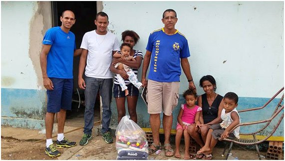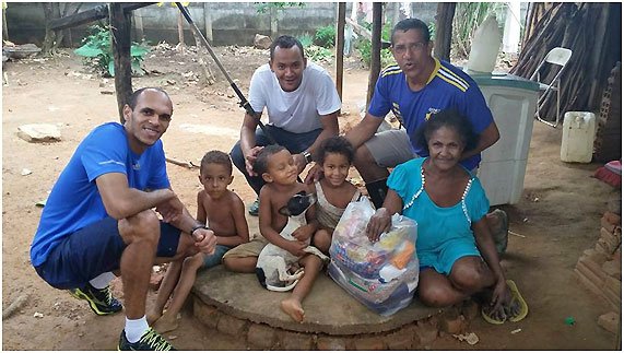 Registro de um dos momentos de distribuição das Cestas Básicas arrecadadas do ‘Futebol Solidário’. Tássio (à esq.), Adrielmi (centro) e Sargento Diniz (à dir.) realizaram a entrega a uma das famílias beneficiadas